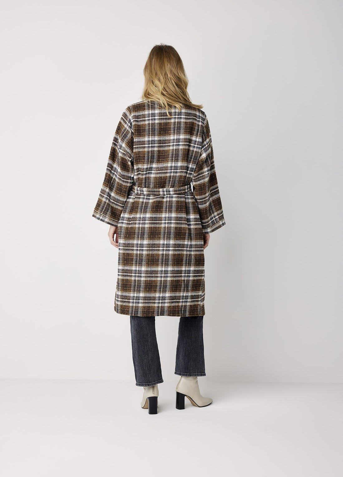 A reversible. collarless. straight jacket with a checked pattern on one side and paisley print on the other. The piping along the neckline and front sections and the loose knotted belt have checked fabric on both sides.